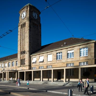 Der Badische Bahnhof in Basel ist ein deutscher Grenzbahnhof auf Schweizer Staatsgebiet. Sein Vorgänger, der alte Badische Bahnhof, war aufgrund von Verträgen zwischen dem Grossherzogtum Baden, der Eidgenossenschaft und dem Kanton Basel-Stadt im Jahre 1855 am Riehenring eröffnet worden, wo heute die Basler Messe steht. Der zunehmende Verkehr und die direkte Anbindung an das schweizerische Bahnnetz sprengten jedoch schon bald das Fassungsvermögen, sodass der Bahnhof um rund einen Kilometer an seinen heutigen Standort verlegt wurde. Entworfen wurde das neue Gebäude vom Schweizer Architekten Karl Moser (1860-1936), eröffnet wurde der neue Bahnhof 1913. Heute ist der Badische Bahnhof nicht nur eine Verkehrsdrehschreibe, sondern auch ein Kulturort: In den ehemaligen Buffets erster und zweiter Klasse ist seit 2002 der «Gare du Nord – Bahnhof für Neue Musik» angesiedelt, das erste experimentelle Musikzentrum der Schweiz, in dem unter anderem bereits Christoph Marthaler und Herbert Wernicke Theateraufführungen inszeniert haben. Mit der «Bar du Nord» gibt es zudem einen multifunktionalen Veranstaltungsraum, den man direkt von den Bahnsteigen aus betreten kann und in dem regelmässig Fussballspiele auf Grossleinwand übertragen werden.